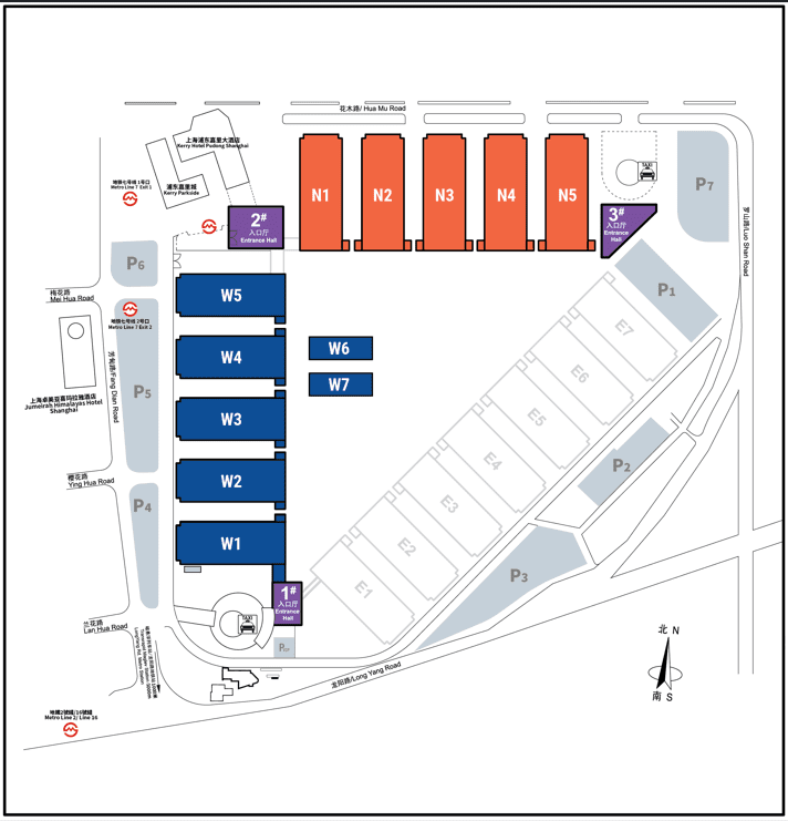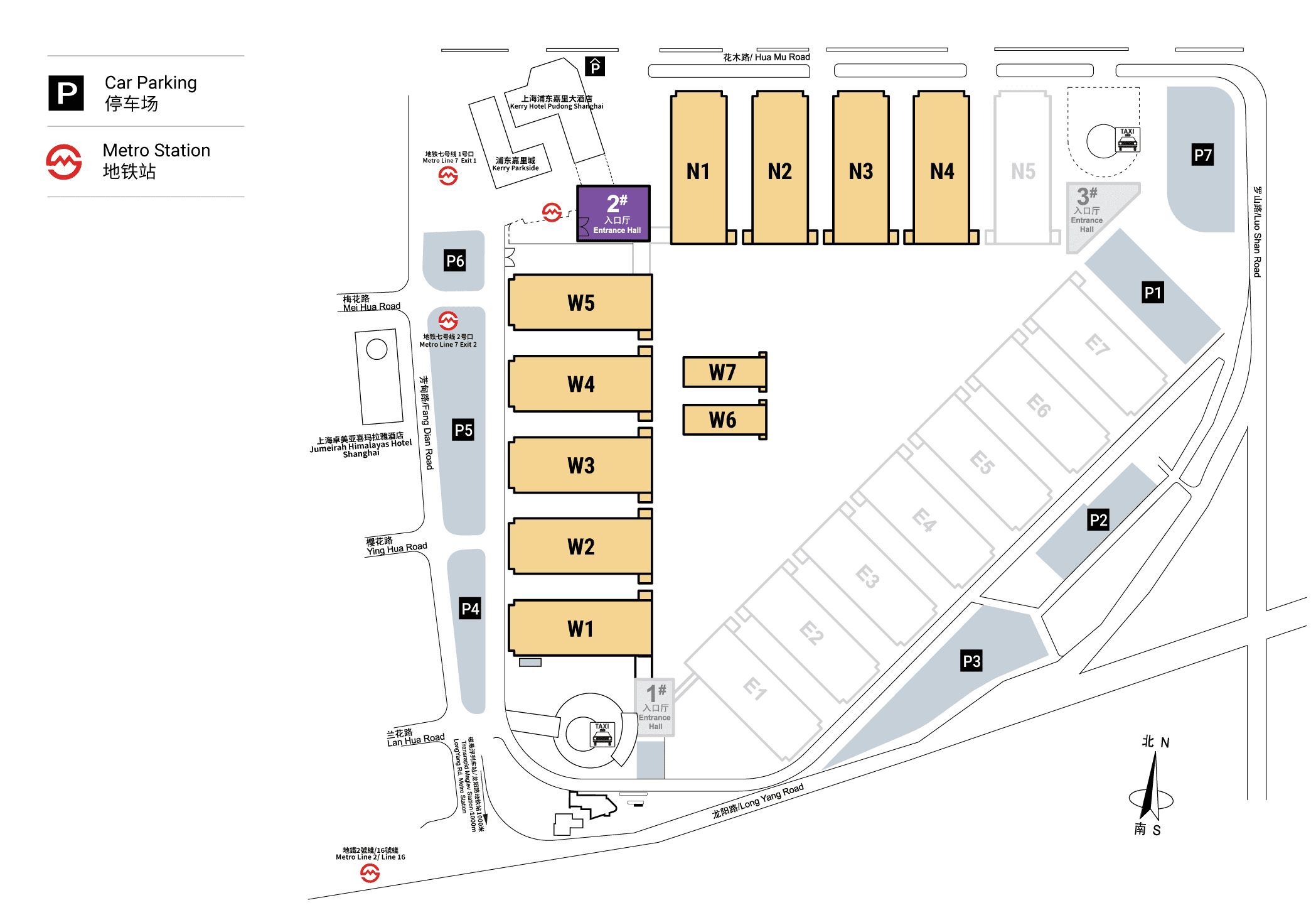 The public traffic interchange named “Longyang Road Station” for buses, metro lines and maglev, stands around 600 meters apart from Shanghai New International Expo Centre (SNIEC). It takes about 10 minutes to walk from the “Longyang Road Station” to the fairground. In addition, Metro Line 7 is direct to SNIEC at Hua Mu Road Station whose exit 2 is close to Hall W5 of SNIEC.